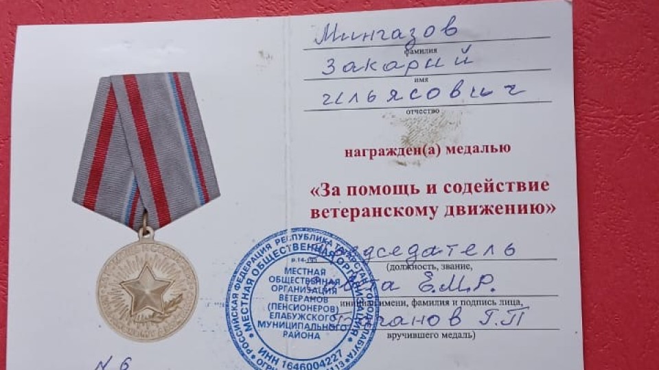 Депутат Елабужского городского Совета, председатель МО партии в Елабужском районе Закарий Ильясович Мингазов награжден медалью "За помощь и содействие ветеранскому движению"