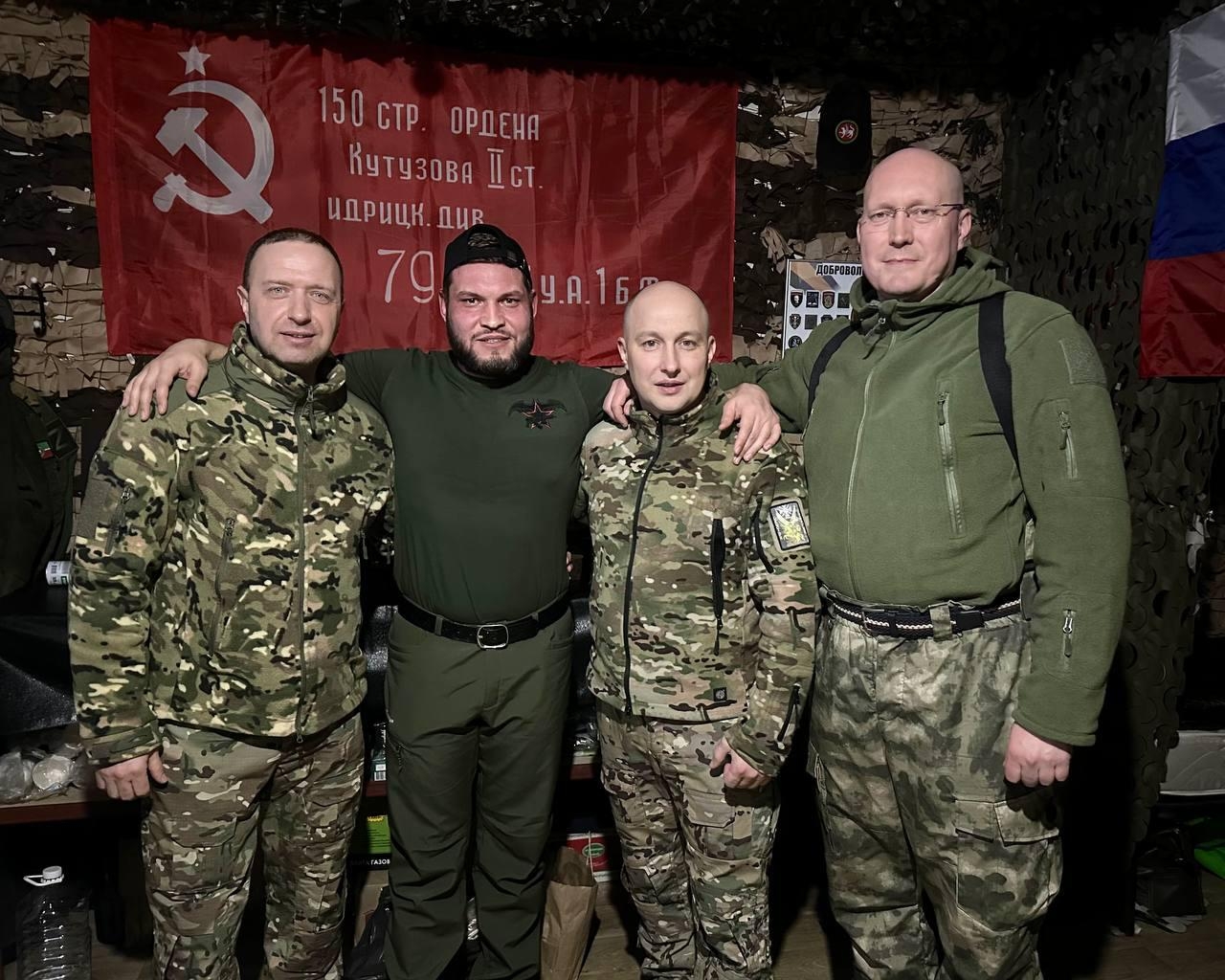 Находящегося в зоне боевых действий депутата Госсовета Татарстана Эдуарда Шарафиева, командующего добровольческой бригадой "Святой Георгий", посетили его коллеги из Татарстана – депутат Госсовета РТ Рушан Мингазов, а также депутаты Казанской гордумы Евгений Зиберт и Юрий Золотарёв.